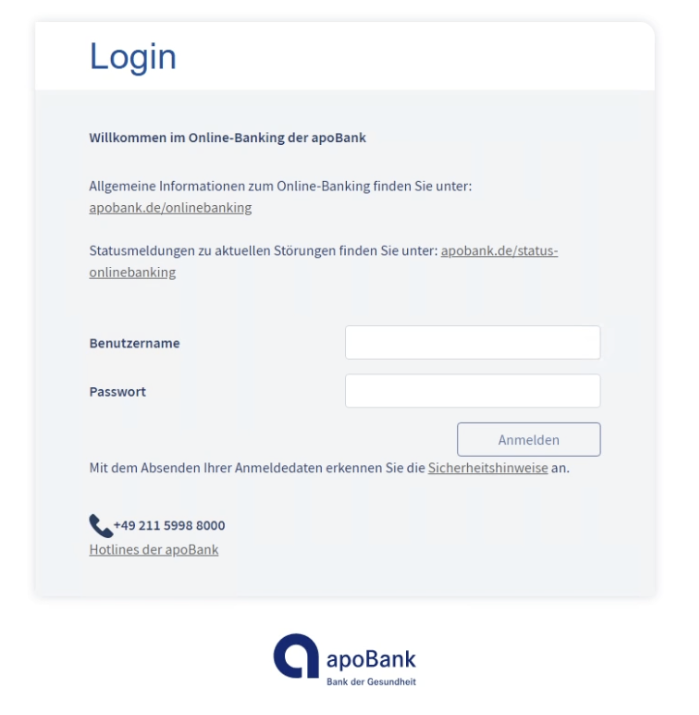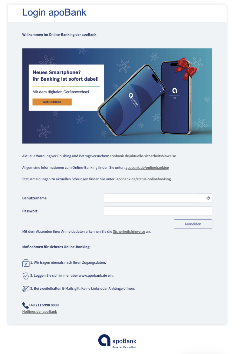 Die originale Loginseite der apoBank sieht aktuell im Übrigen so aus: