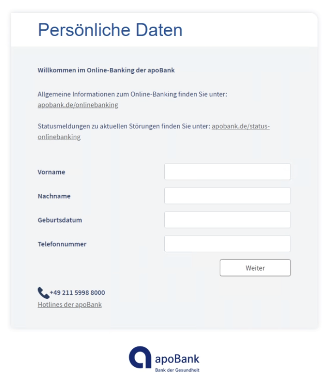 Im ersten Schritt der Webseite wurden die Logindaten der apoBank für den vermeintlichen Login abgefragt. Dieser dient den Angreifern grundsätzlich erstmal für den Login zu den Konten des Phishing E-Mail Empfängers.
