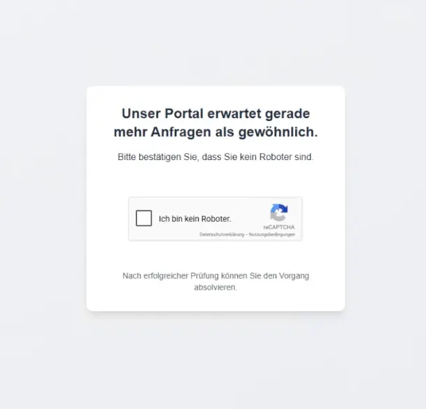 Klickt man auf den Link oder Button „Jetzt Daten aktualisieren“, gelangt man auf eine Webseite, die vorgibt, aufgrund hohen Datenverkehrs überlastet zu sein. Es wird daher eine Überprüfung durchgeführt, ob es sich beim Empfänger der E-Mail um einen Roboter oder einen Menschen handelt.